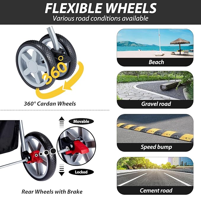 - 【360° Cardan Wheels with Brake】The dog stroller has two 360° universal front wheels, which can easily pass through sand, gravel roads, and speed bump. And cat carrier comes with 2 rear brakes to ensure smooth locking and is suitable for small, medium or elderly dogs and cats.(PS: The front wheels are locked down to keep driving straight.)