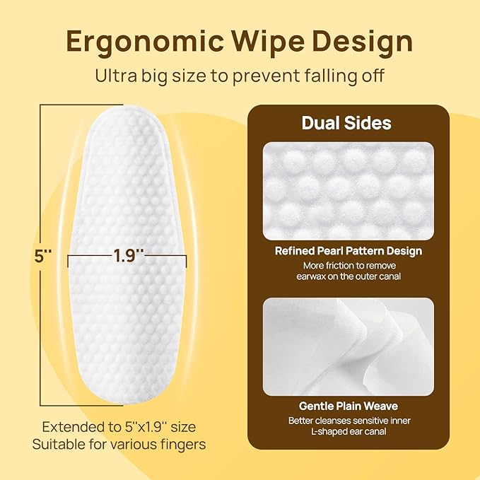 - 【Ear Finger Wipes Plus】Extended pet ear finger wipes size to 5'' x 1.9'', ensuring easier to wear on fingers and Anti-slip off. Crafted from high-quality 100% biodegradable plant fibers, our dog ear cleaning wipes are gentle and soft on the skin. Dual-sided texture caters to the varying needs of different areas of the ears; Pearl cotton is for heavy dirt on the external side of the ear, while the plain weave is ideal for the sensitive inner areas.