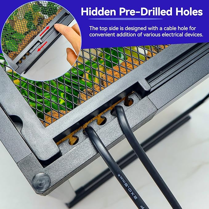 - 【Hidden Pre-Drilled Holes】: The terrarium's top is equipped with pre-drilled holes, perfect for setting up lighting, misting systems, and other reptile tank accessories. Whether you're creating a chameleon cage, a large terrarium, or a vivarium tank, this feature adds practicality without compromising aesthetics.