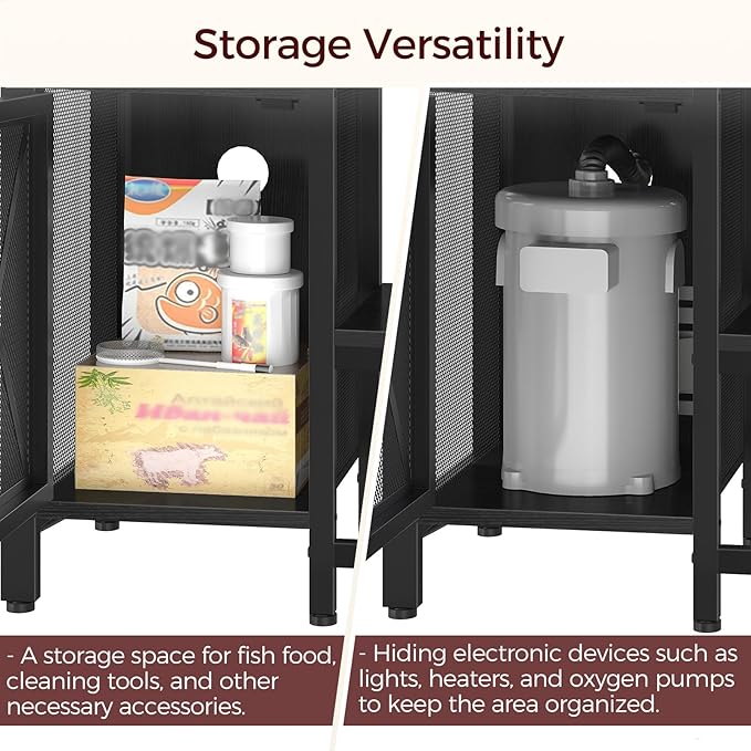 - Ample Storage: The fish tank stand with storage cabinets and shelves provides the right space for filters, tubing, fish food, etc., while the open shelves are functional for displaying accessories. Keep your aquarium area tidy and functional with everything at your fingertip