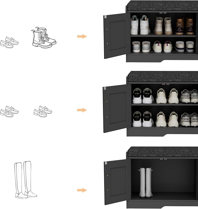 - Keep Your Shoes Organized: The depth of bench is 13.8 inches, which makes it easily to put in your shoes, meanwhile shoes of various heights can be placed by adjusting middle movable boards. The bench doors design ensures not only your privacy, but also a tidy space
