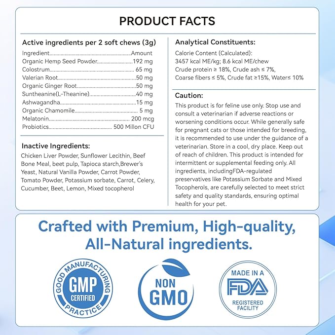 - Natural and Healthy Ingredients: Crafted with natural ingredients like organic hemp seed powder, L-Tryptophan, valerian root, chamomile, colostrum, and melatonin, our calming treats for cats are scientifically formulated to ease tension and improve sleep quality. Free from artificial additives, grains, or sugar, they provide safe and reliable support for your catโs health.