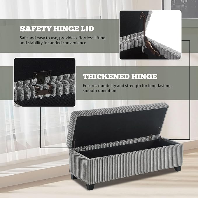48" Ottoman with Storage, Corduroy Storage Ottoman Bench for Bedroom, End of Bed Bench with Safety Hinge for Living Room, Bedroom, Entryway, Grey