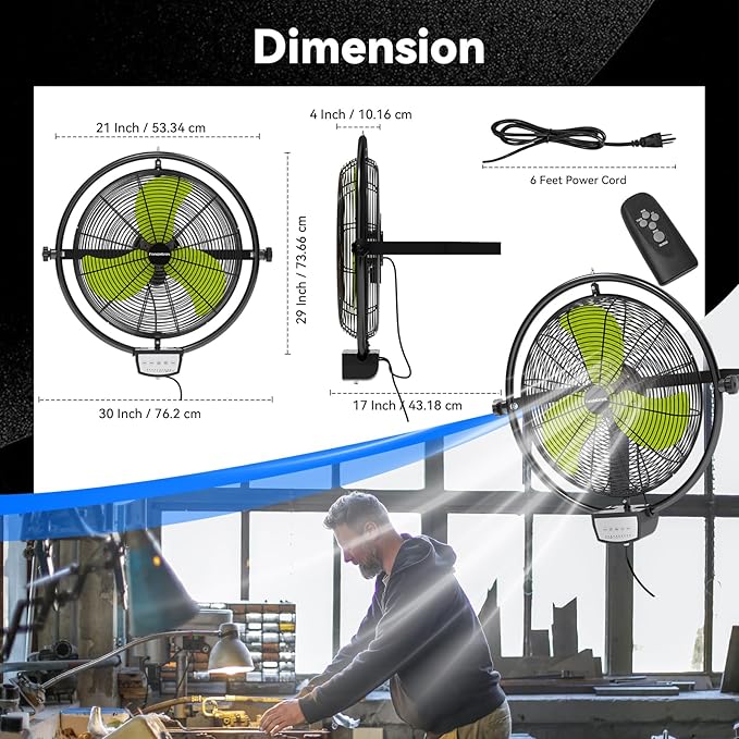 - ๐๐ข๐ ๐ก ๐๐๐ฅ๐จ๐๐ข๐ญ๐ฒ ๐๐ข๐ซ ๐ ๐ฅ๐จ๐ฐ - The heavy duty wall fan design makes the operation more intuitive and simple, and the high, medium and low speeds can be adjusted by the remote control to meet different needs. High speed 5500 CFM, medium speed 4000 CFM, low speed 3800 CFM, providing hurricane-like airflow to meet your garages, shops or outdoor use๏ผNote: used on a covered patios or porch, BUT NOT EXPOSED TO RAIN๏ผ