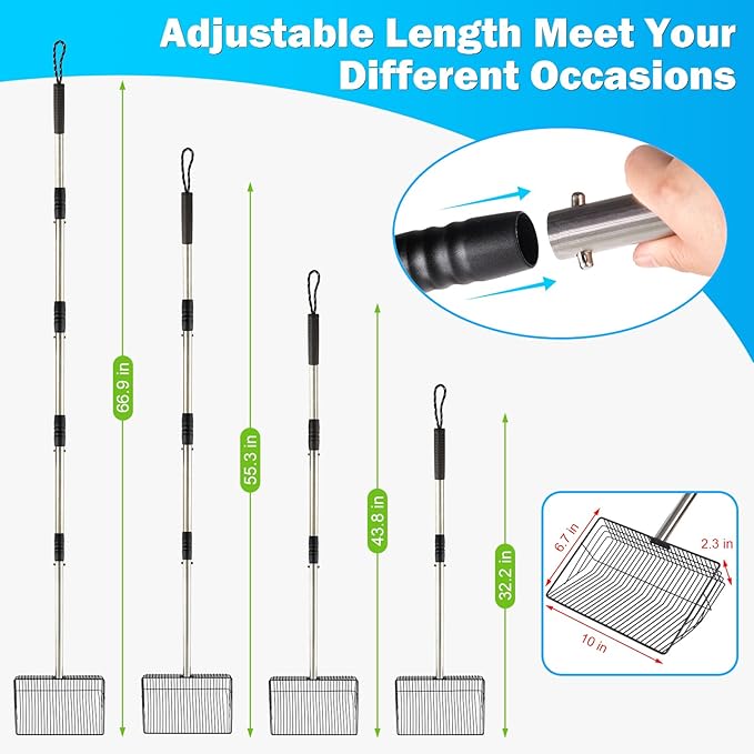 - 【4 in 1 Adjustable Stainless Steel Handle】Chicken poop scooper adjustable to 32 inches, 43 inches, 55 inches, and 67 inches, with simple rotating thread connection for easy use by people of different heights/scenes. Very suitable for cleaning chicken coops, dog piles, cleaning sandboxes, and shoveling hay and straw