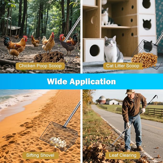 - 【Multi Functional Sieve Shovel】 This chicken poop scooper long handle can be used for large-scale cleaning work in chicken coops, and can also be adjusted to the appropriate length for use as a cat litter shovel, beach search sand shovel, and cowshed shovel, etc