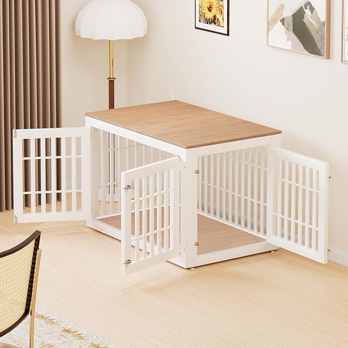- 【Double Doors Design】The dog kennel furniture has a front door and a side door, your pet will go in and out easily with double doors. The double-doors design can adapt to more different space environments. You can decide whether to open the front door or the side door according to your needs.