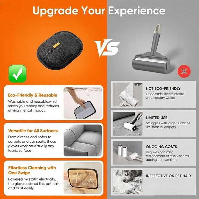 - 【Versatile Use on Multiple Surfaces & Hard-to-Reach Areas】Lint rollers for pet hair extra sticky Works effortlessly on pet hair embedded in clothing, beds, carpets, sofas, car seats, and narrow gaps. Save money on specialized tools – one glove cleans all fabrics from stubborn cat hair to dog hair on delicate upholstery, making it an excellent cat hair remover furniture tool